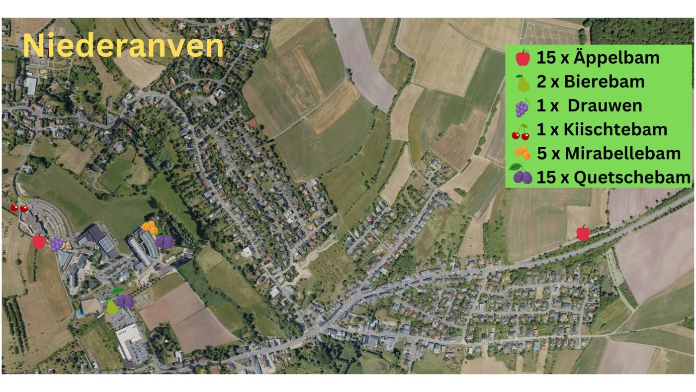 Insgesamt 17 Kinder aus der Gemeinde, die 2024 zur Welt gekommen sind, haben am 15. November 2025 12 Äpfel- und Birnenbäume auf dem Komplex ,, Am Sand'' beim CIPA ,,Gréngewald'' Niederanven gepflanzt. Nach der Pflanzaktion konnten sich Groß und Klein bei einem Essen stärken und die Kinder haben als Andenken an diesen tollen Tag ein Schneitbrett aus heimischem Holz mit ihrem Namen geschenkt bekommen.
