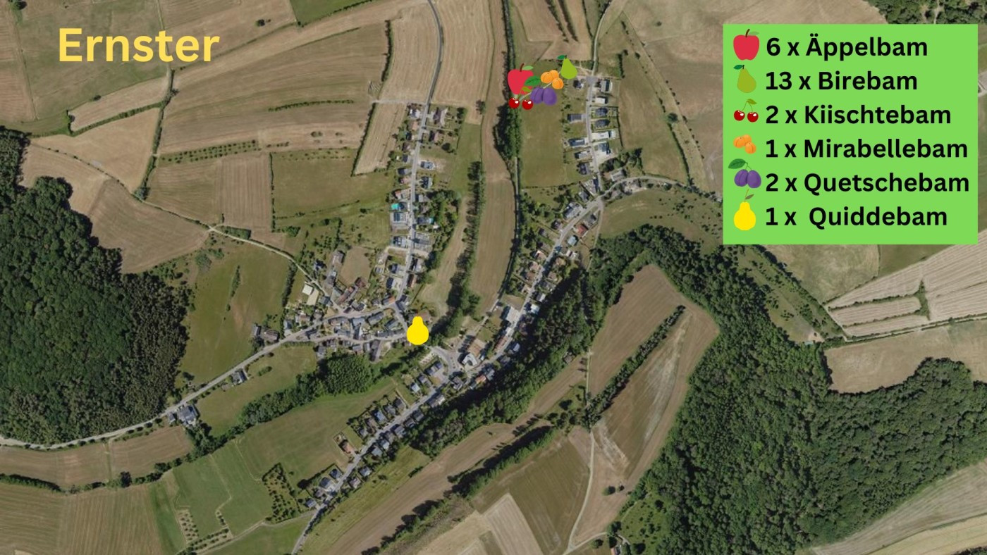 Bei Obstbäumen, die mit einem gelben Band gekennzeichnet sind, dürfen Sie die Äpfel, Quitten, Kirschen, Birnen, Zwetschgen oder auch Trauben pflücken. Bedienen Sie sich und helfen Sie mit zu vermeiden, dass jedes Jahr maßenhaft Obst in den Gärten und öffentlichen Plätzen fault! Hier drunter finden Sie die Standorte und die Obstsorten, die es in unserer Gemeinde gibt.