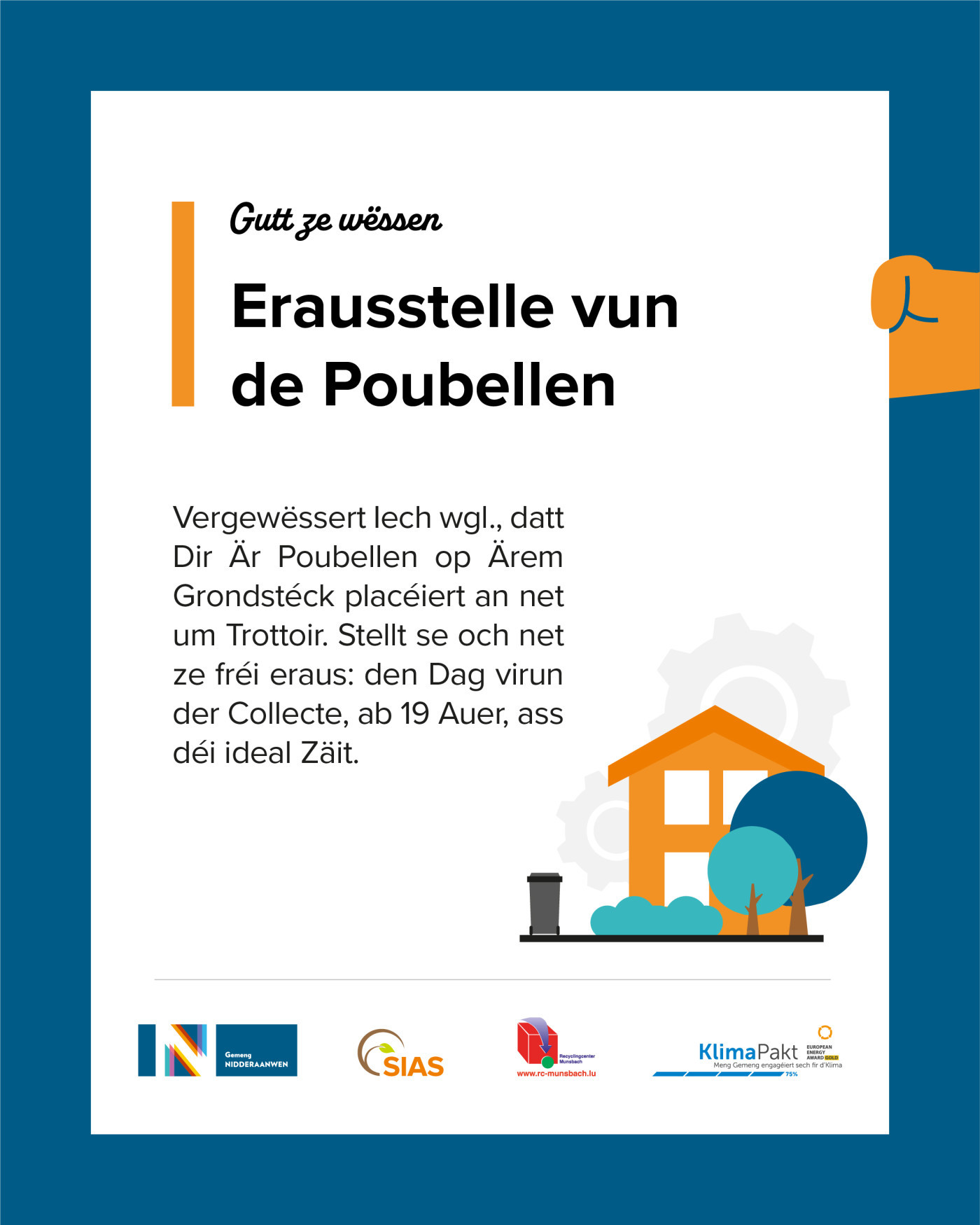 Fir sécher ze stellen, dass Är Poubelle och wierklech eidel gemaach gëtt, placéiert se op Ärem Grondstéck, an dëst am Beschten den Dag virun der Collecte ab 19 Auer.