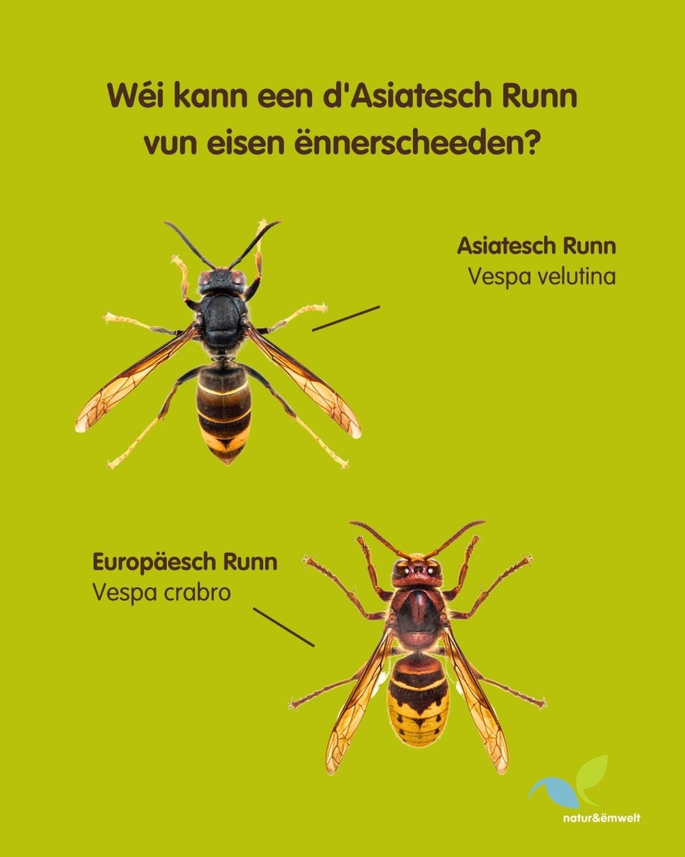 The Asian hornet has become firmly established in Luxembourg. For this reason, we invite you to take a closer look at the new information post by natur&ëmwelt. There you will learn all about the differences between the European and the Asian hornet!