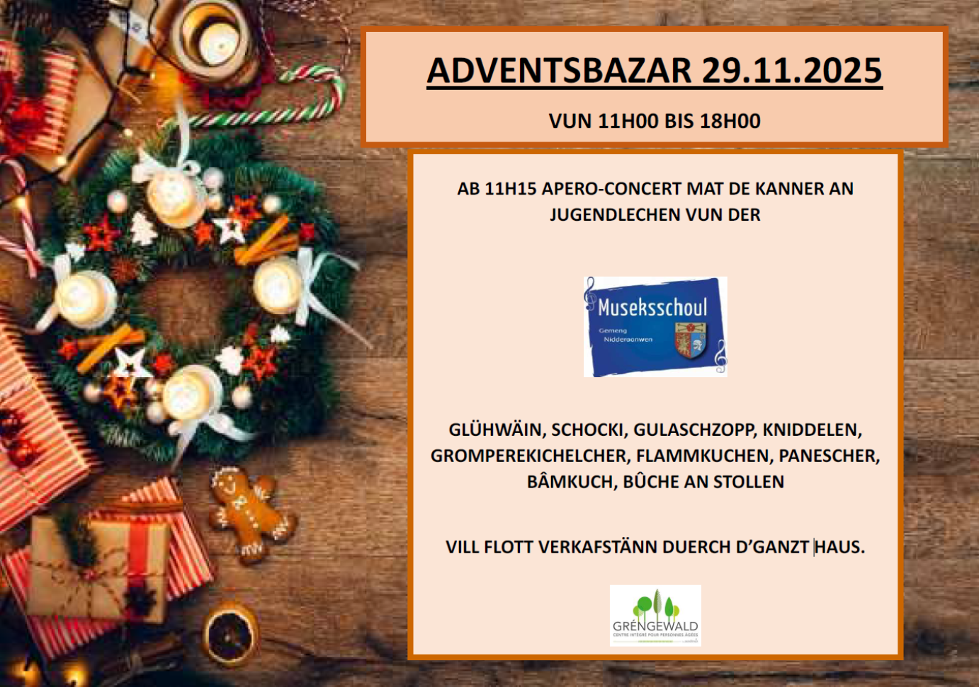 mat Glühwäin, Schocki, Gulaschzopp, Kniddelen, Gromperekichelcher, Flammkuchen, Panescher, Bamkuch, Bûche a Stollen
