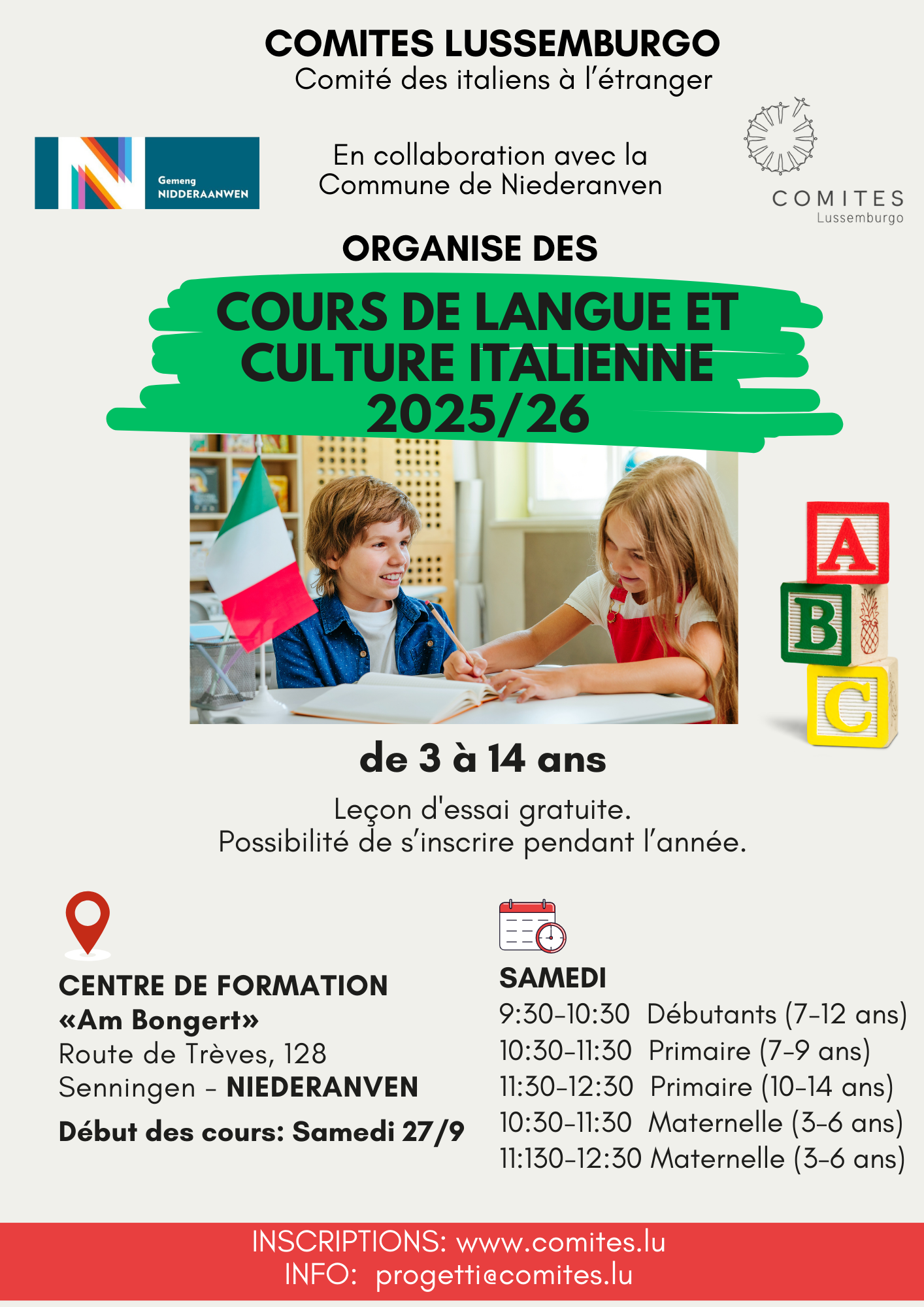 Les cours de langue et culture italienne organisés par le Comites s'adressent à tous les enfants de l’école maternelle, primaire et début secondaire, de 3 à 14 ans, de toute nationalité, selon un principe d’inclusion, avec ou sans connaissance de la langue italienne.