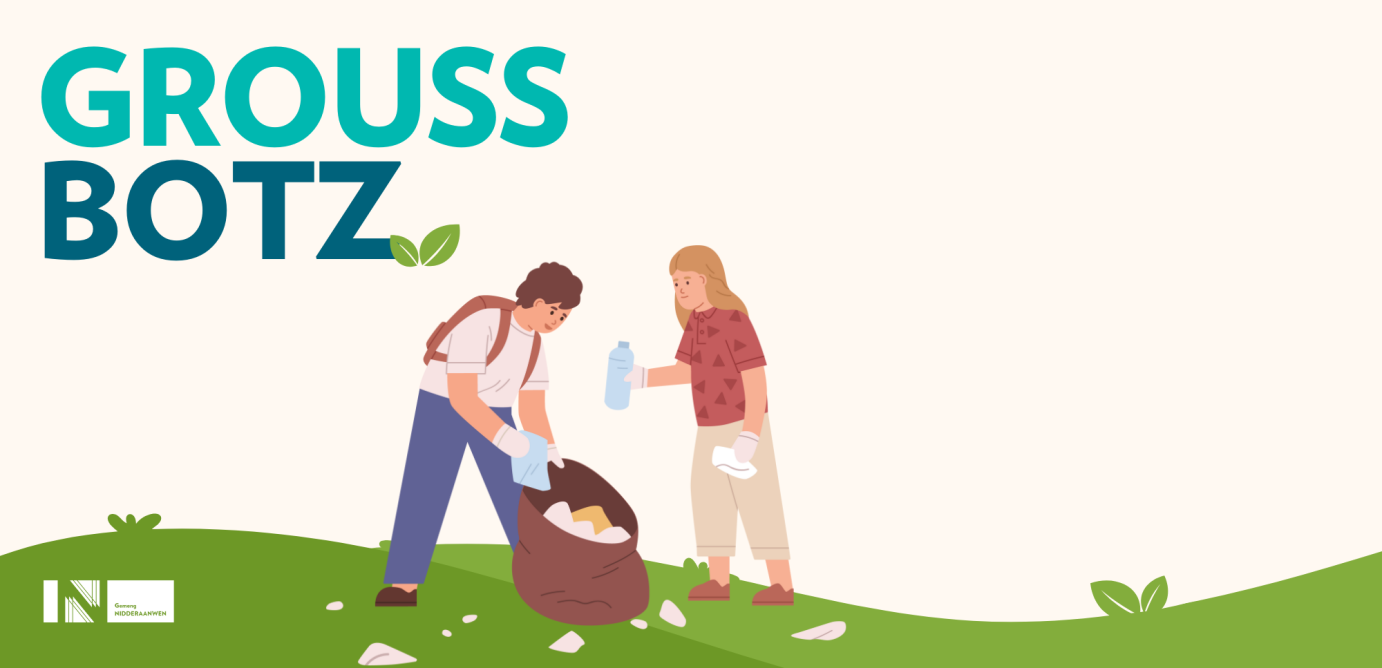 Mellt Iech fir d’Campagne “Grouss Botz” un a hëlleft eis, d’Gemeng propper ze halen. Mir starten um 09:30 Auer virun der neier Sportshal “Am Sand”, wou d’Gruppen an Touren agedeelt ginn.