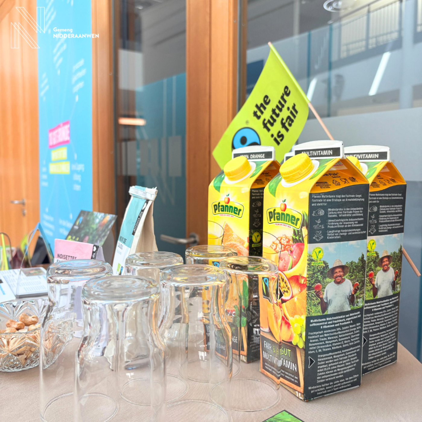 De Sonnden, 7. Mee, hat d'Ëmweltkommissioun vun der Gemeng Nidderaanwen op de faire Brunch invitéiert. Eng knapp 70 Leit hunn et sech net entgoe gelooss, fir mat fair gehandelte Produite gutt an den Dag eranzestarten. An dësem Kader sinn och 2 Schecke vun de Kommissioune vun de 4 SIAS-Gemengen an der Héicht vu jeeweils 1.250€ for d'Stroossenenglen a Rokku Mi Rokka iwwerreecht ginn.
