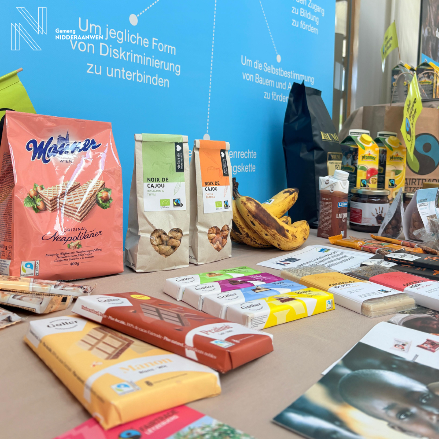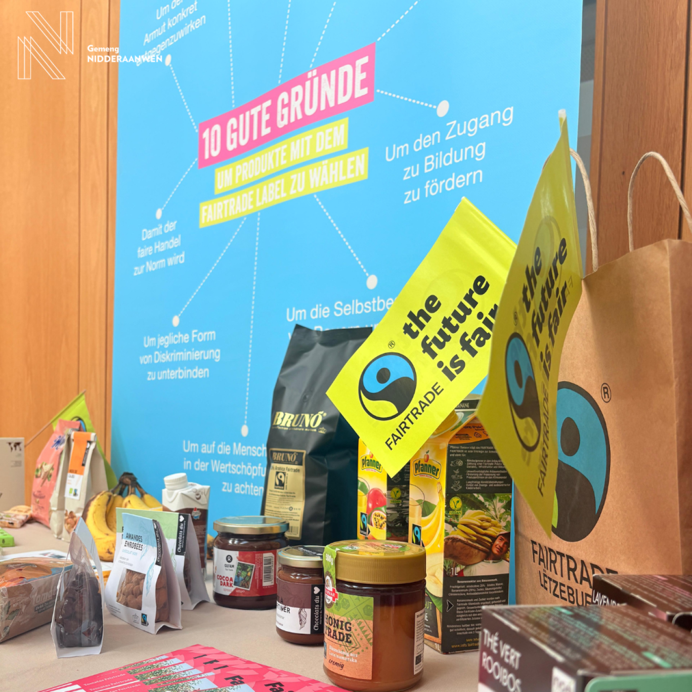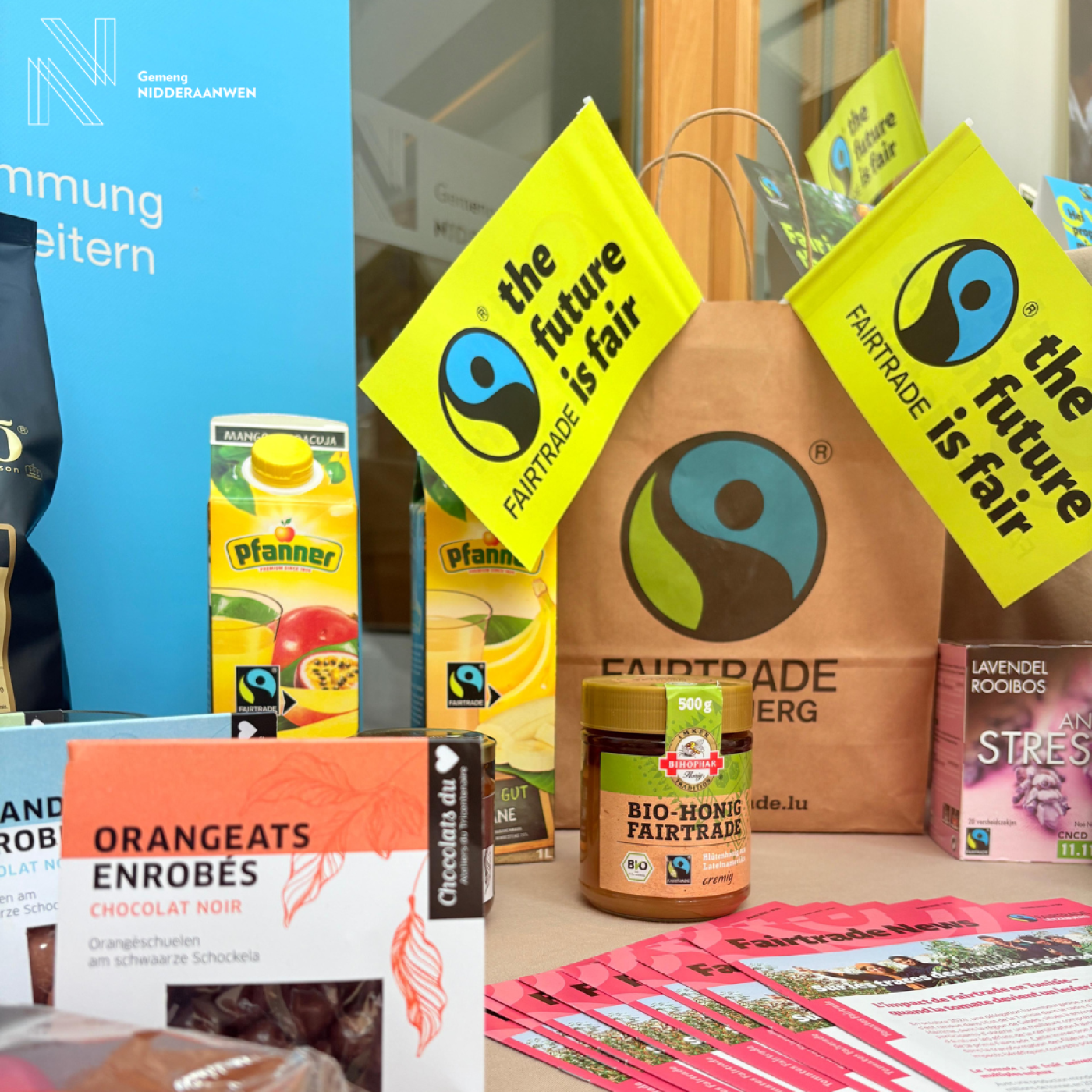 Als zertifiéiert Fairtrade-Gemeng maache mir och dëst Joer nees bei de Fairtrade-Woche mat. Sou kënnt Dir nach bis den 23. Mee op d'Gemeng eis Ausstellung besichekommen an Iech natierlech och un de Leckereien zerwéieren, dee mir fir Iech prett gestallt hunn.