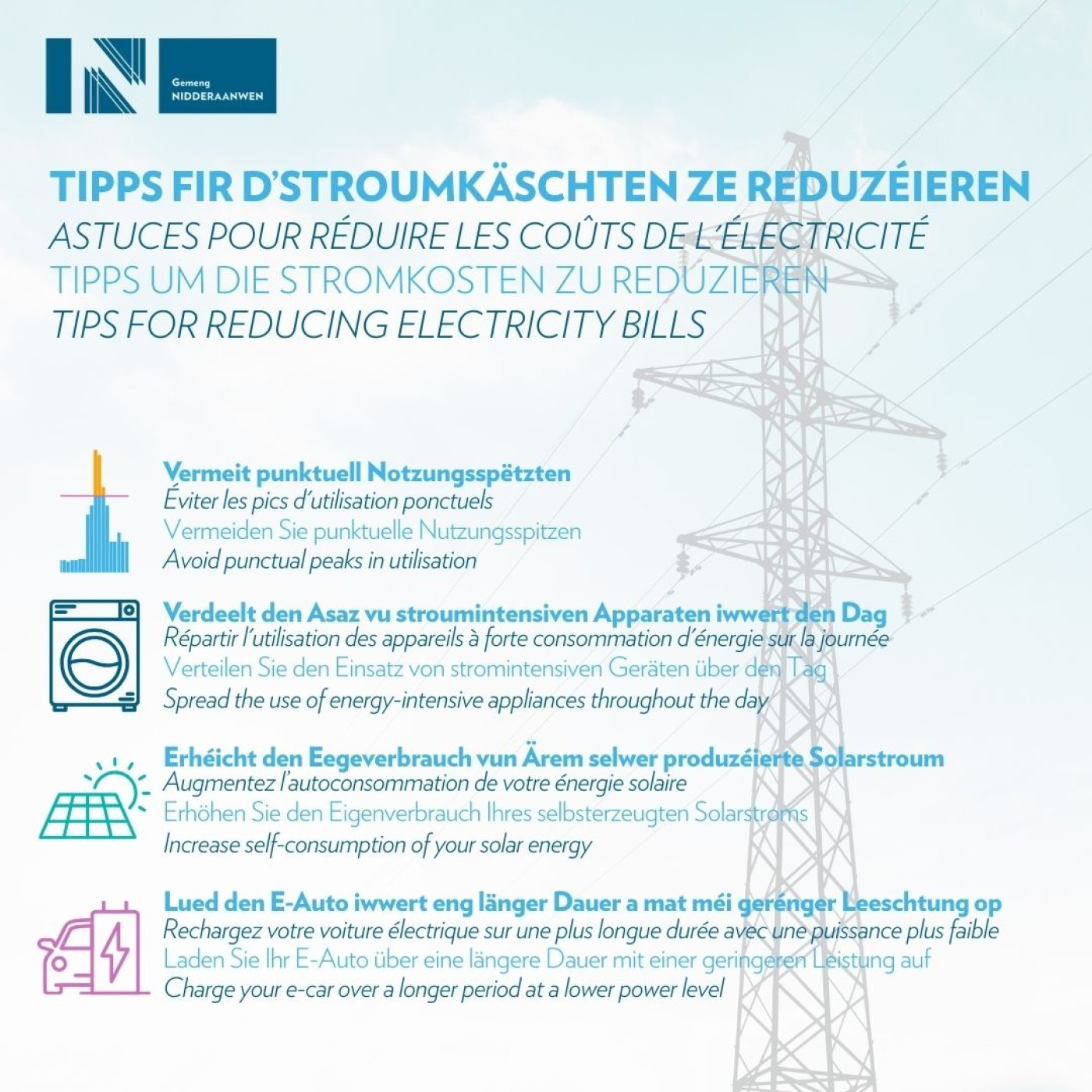 Energiespueren ass d'Gebot vun der Stonn. Vill Stéit iwwerdenken am Moment hir Gewunnechten a probéieren, keng Energie ze verbëtzen. Hutt Dir och wëlles, Ären Energieverbrauch ze optimiséieren, Är Ofhängegkeet vun Energieliwwerungen a Krisenzäiten ze reduzéieren a beim Klimaschutz bäizedroen?