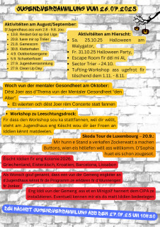 Eise Projet fir deng Matbestëmmung! Eemol de Mount, op engem Samschden hu mir eng Jugendversammlung mat engem leckere Brunch dobäi. Zesumme mat iech entscheede mir iwwert d'Aktivitéiten, Projeten a Kolonien oder iwwert d'Gestaltung vum Jugendhaus. Du hues eng Iddi? Da komm a looss eis se zesummen ëmsetzen!